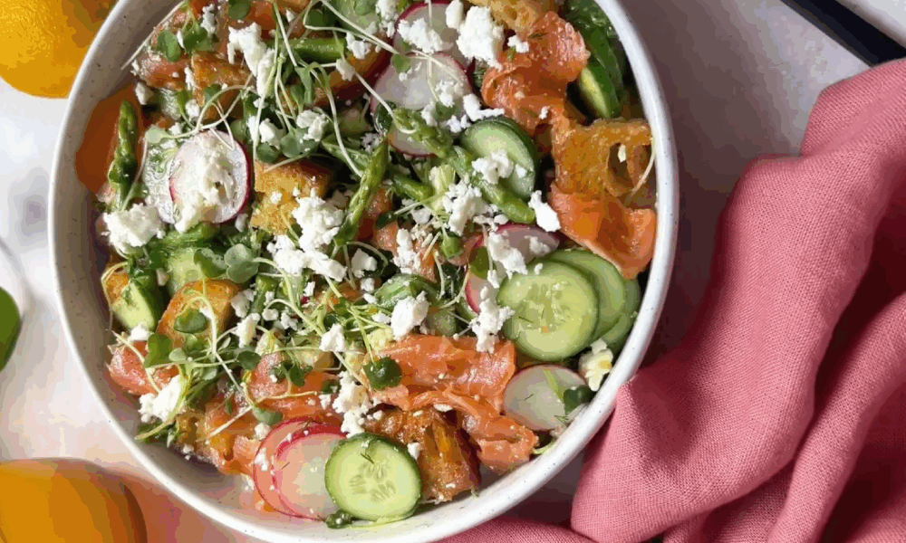 This smoked salmon panzanella is a true explosion of flavours and textures, from crunchy bread croutons, soaked in a vinaigrette made with Dijon mustard, extra virgin olive oil, and apple cider vinegar, crisp cucumbers, smoked salmon and fresh asparagus for crunch.