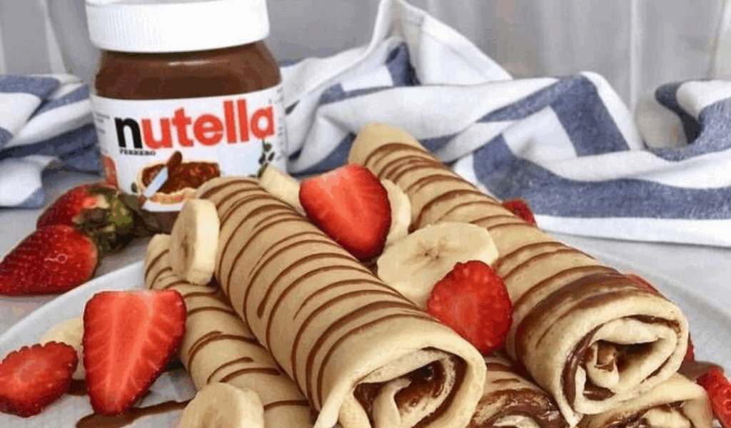 - Starting in order with the first crêpe cooked, spread the table spoonful of Nutella on each crêpe. Top with banana and fresh strawberries. Another way to serve it is to make a crêpe burrito, placing fruit in the middle and folding the edges over to roll it into shape, and finally drizzling with Nutella and sprinkling with toasted almonds. And, serve!