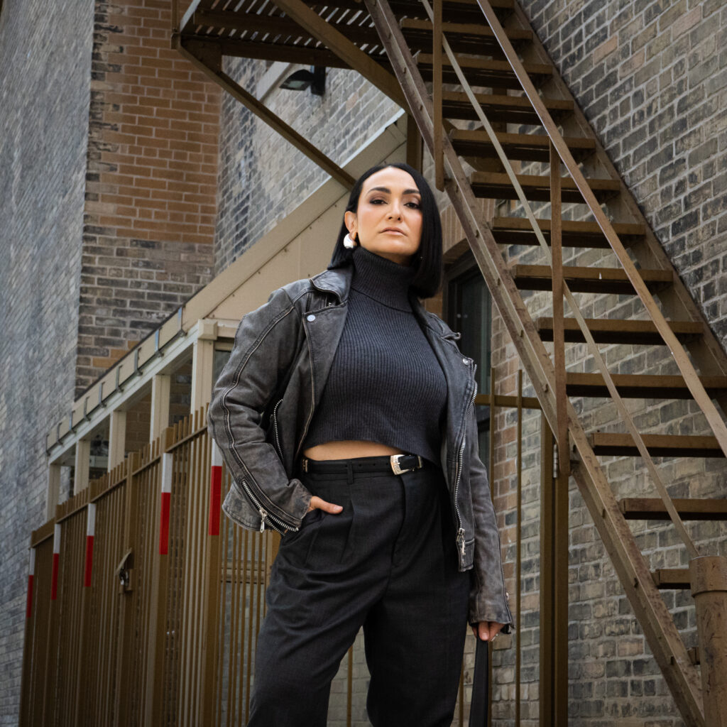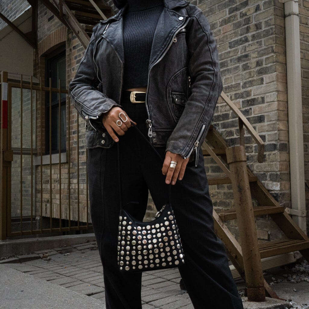 Vintage goes seamlessly with new and local brands. Outfit credits: Amazon silver teardrop earrings, Value Village distressed leather moto jacket, Aritzia wool turtleneck sweater, Value Village belt, Value Village men’s grey trousers, Value Village studded handbag, Biko circle rings, and flea market silver ring.