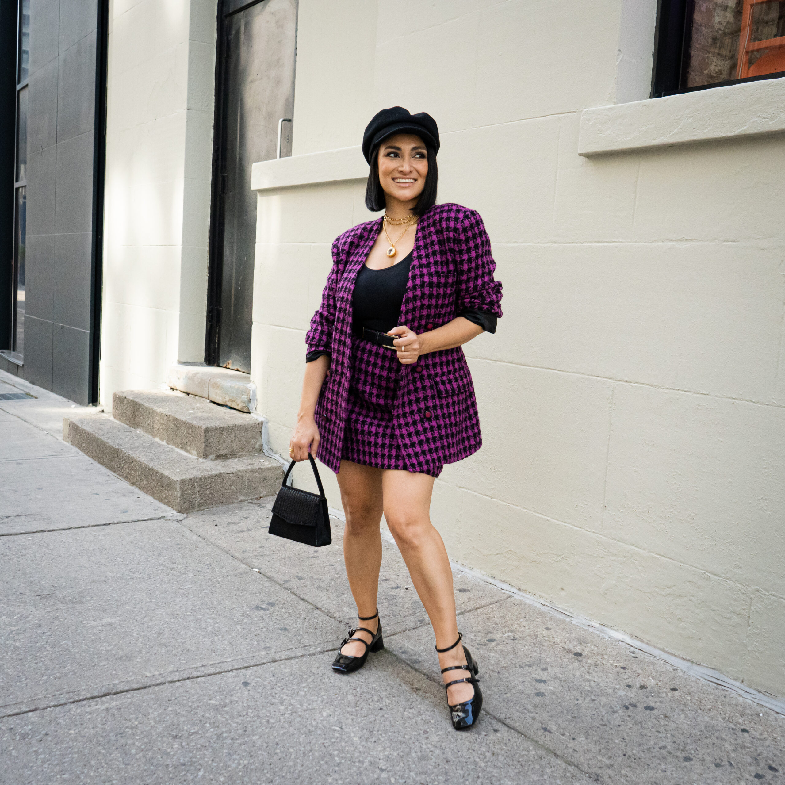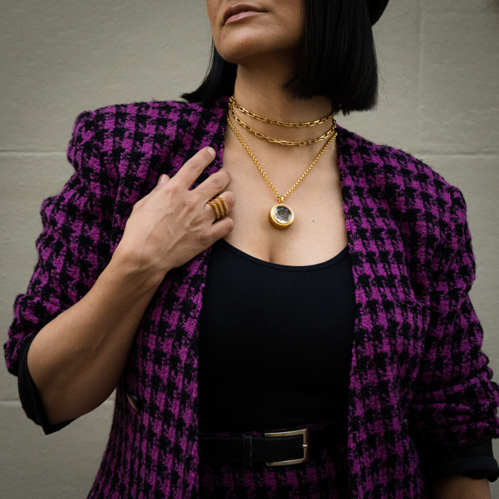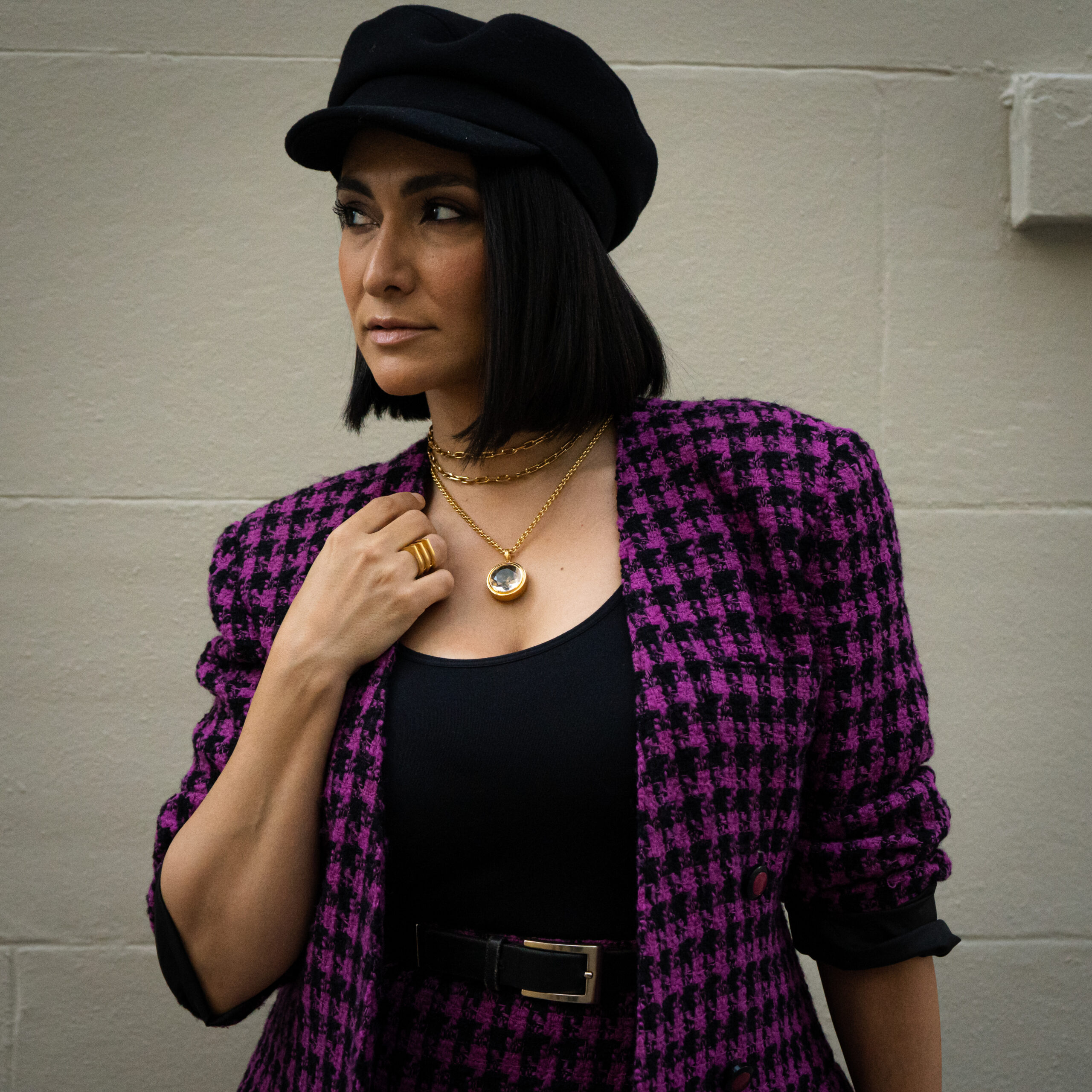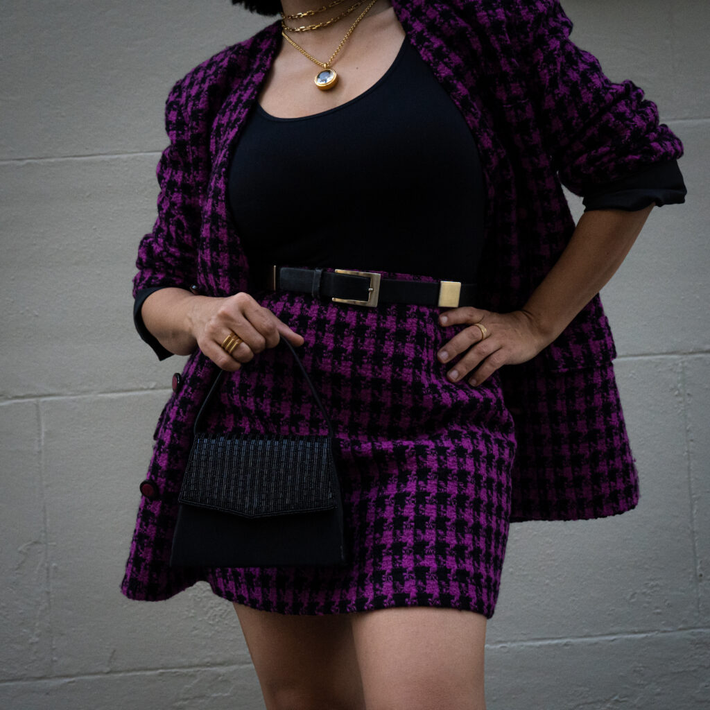 Again, vintage doesn’t have to be an all-out commitment. Keep the new-ish clothes in your closet and pair them with pre-owned pieces. Outfit credits: H&M, newsboy cap, Value Village purple houndstooth wool suit set, Winners tank top, Dean Davidson layered gold necklaces and gold ring, Value Village belt, Value Village satin mini handbag, and Zara patent Mary Janes.
