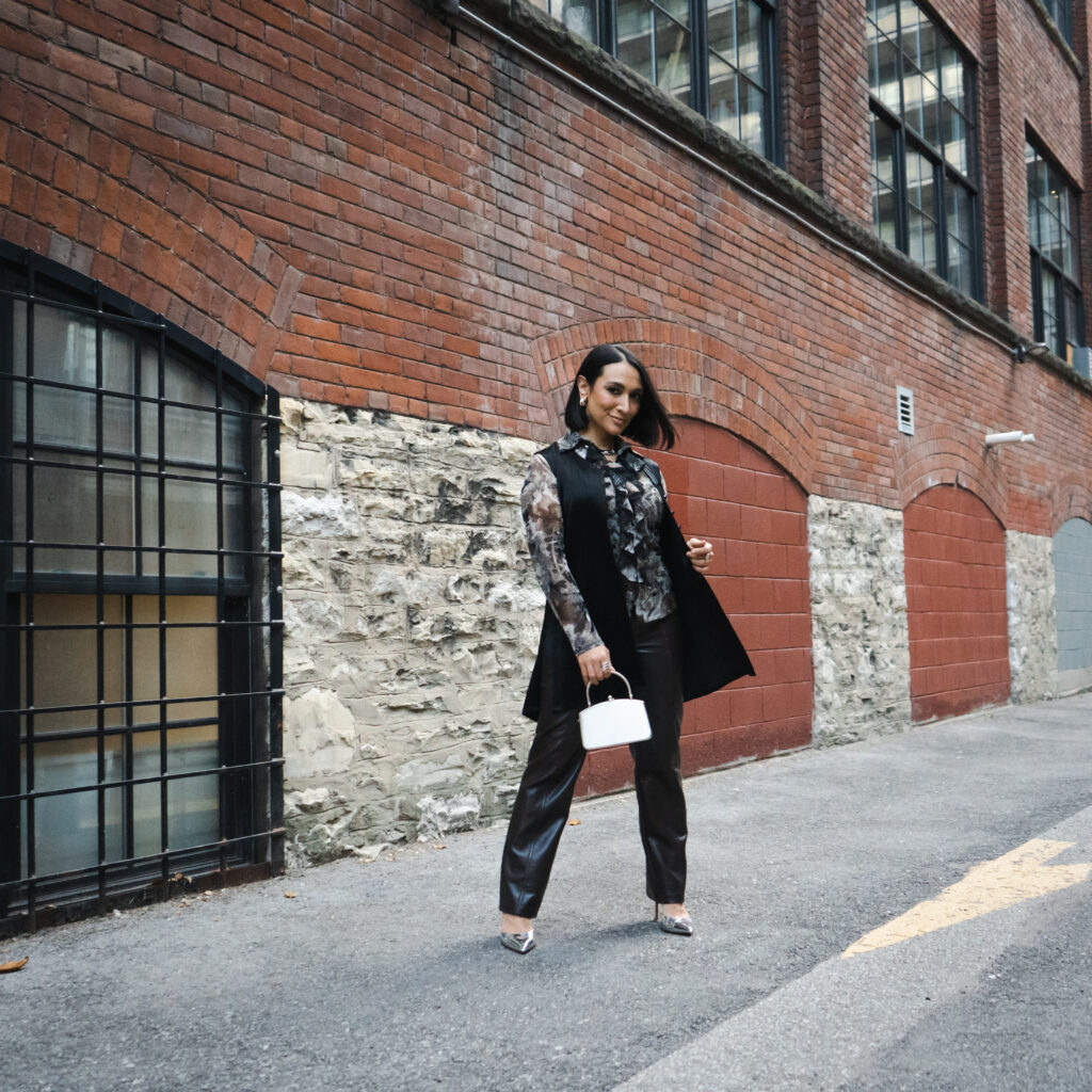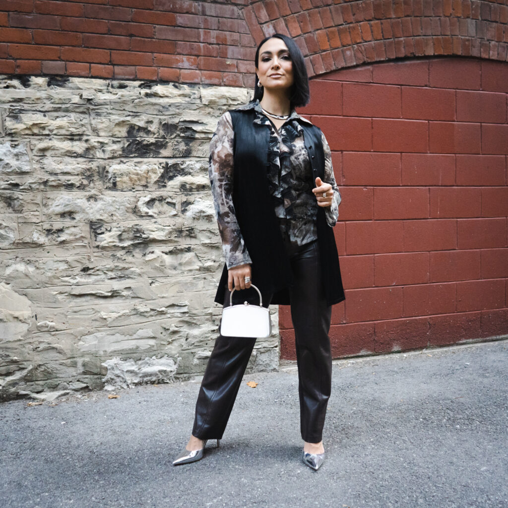 More styling with vintage. Outfit credits: Jenny Bird silver-plated earrings, Toronto Vintage Clothing Show silver-plated necklace, Value Village ruffled blouse, Value Village satin vest, Value Village box clutch with handle, Aritzia brown faux leather trousers, and Mango pumps.